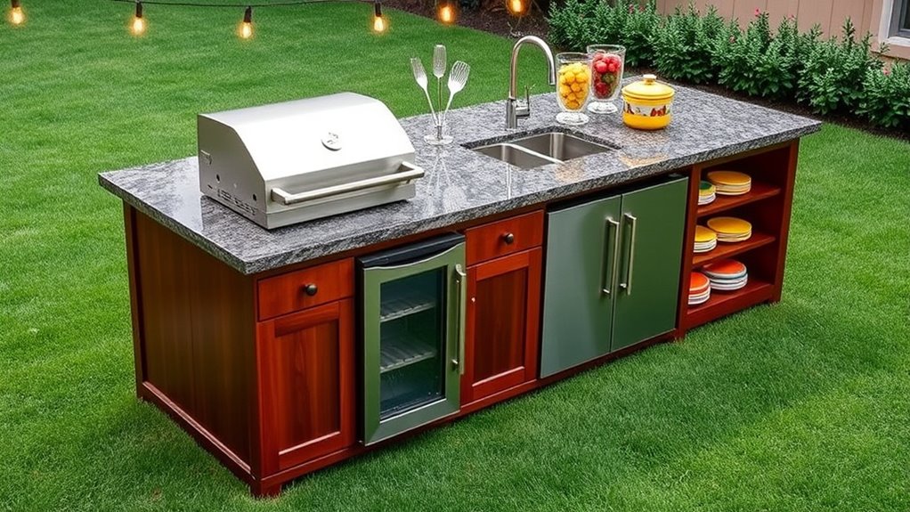I recommend using stainless steel for outdoor kitchen islands because it’s incredibly durable, resistant to rust, and easy to clean. Teak or cedar wood also work well if properly sealed, offering natural beauty and weather resistance. For a more budget-friendly option, concrete with weatherproof sealants provides strength and longevity. Whichever material you choose, make certain it’s treated or sealed regularly to withstand the elements and keep your outdoor kitchen looking great.