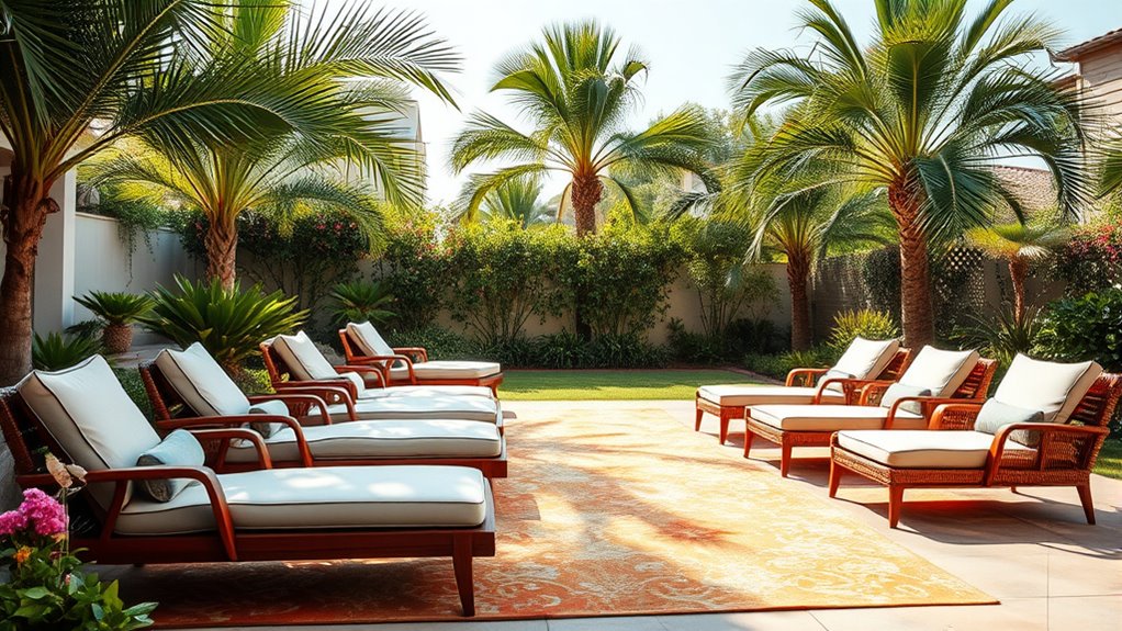 When selecting outdoor lounge chairs, I focus on factors like material durability and ease of care to make certain they last through the seasons. Comfort and adjustable features are also key, so I can relax just the way I want. Additionally, I consider portability, storage options, and weather resistance to keep my space functional and low-maintenance.