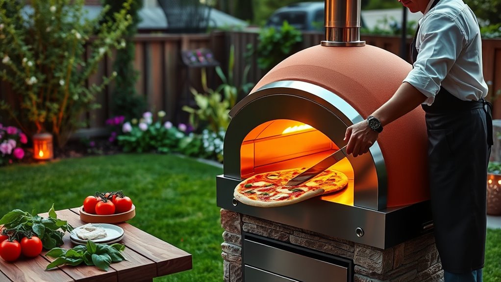 Choosing a durable outdoor pizza oven means paying close attention to the materials it’s made from, as these determine how well it withstands the elements and regular use. High-quality materials like stainless steel, cast iron, or powder-coated carbon steel are essential because they resist rust and corrosion, especially in humid or harsh environments. Thick, insulating shells help retain heat efficiently, reducing energy consumption and ensuring consistent cooking. Selecting corrosion-resistant materials not only prolongs the oven’s lifespan but also maintains its appearance over time. Properly chosen durable materials also ensure safety by preventing warping, cracking, or other damage during high-temperature cooking. Overall, investing in a well-constructed oven with resilient materials guarantees longevity, performance, and peace of mind.