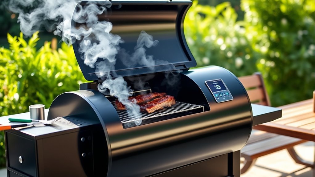 A pellet smoker with Wi-Fi becomes much easier to operate when it features an intuitive control panel or a user-friendly app interface that simplifies adjusting temperatures and monitoring cooking progress. Remote control via Wi-Fi lets me manage settings and receive alerts from anywhere, reducing the need for constant manual checks. Automatic pellet feed and ignition systems make long cookouts hassle-free by minimizing manual interventions. A clear, real-time display or app notifications for temperature, pellet levels, and cooking status help me catch issues early and ensure consistent results. Compatibility with smart devices and straightforward controls make the smoker accessible for beginners and efficient for seasoned grillers alike. Overall, these features considerably enhance ease of use, allowing me to focus on perfecting my dishes.