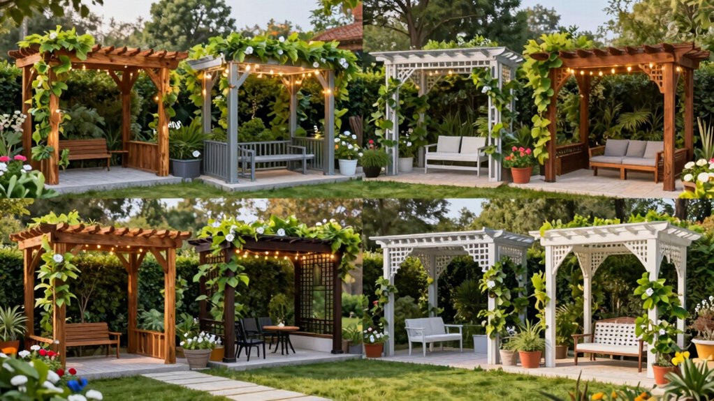 If you’re looking to upgrade your outdoor space in 2026, I recommend exploring the top nine pergola kits, featuring durable cedar wood, modern aluminum options, and various roof styles like slatted, trellis, and adjustable designs. These kits are easy to assemble, customizable, and equipped with weatherproof features to withstand harsh conditions. Want to discover which one fits your style and needs best? Keep going for all the details you need to make the right choice.