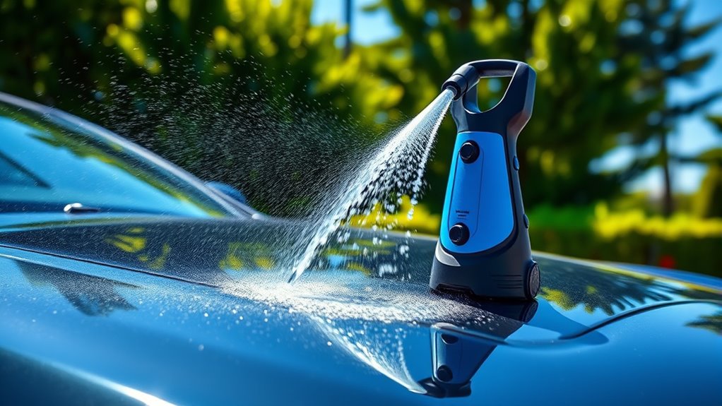 Choosing the right pressure and power levels is essential for effectively cleaning your car without risking damage. For most vehicles, a pressure washer with 1200 to 1900 PSI is ideal to remove dirt and grime without harming the paint. Higher pressures, like 2500 PSI or more, can be risky if not used carefully, potentially damaging delicate surfaces. A flow rate of around 1.2 to 1.5 GPM balances cleaning power with water conservation and surface safety. Adjustable pressure settings are a great feature, letting you customize spray intensity for different areas of your vehicle. Additionally, using nozzles with turbo or variable pressure options can boost cleaning performance while maintaining safe pressure levels. Choosing the right combination ensures a thorough clean without risking your car’s finish.