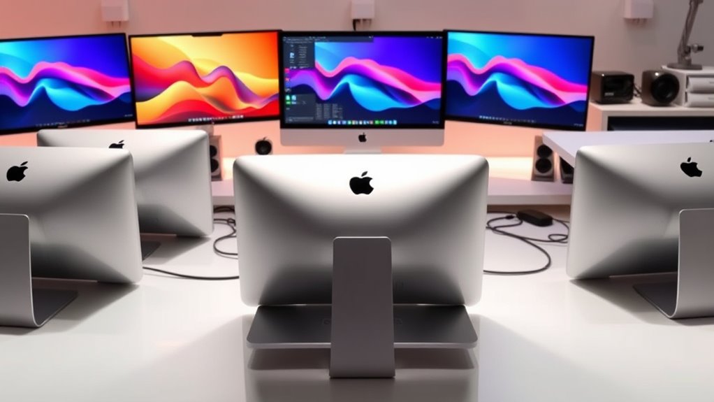 I’ve reviewed the top renewed Mac Studio desktops of 2025, which balance power and value for demanding workflows. The Mac mini with M4 Pro offers a compact, budget-friendly option, while the 14.2-inch and 16-inch MacBook Pros with M4 Max are perfect for high-performance tasks on the go. Each provides impressive specs like large RAM and fast SSDs. To find out which model suits your needs best, keep exploring the options ahead.