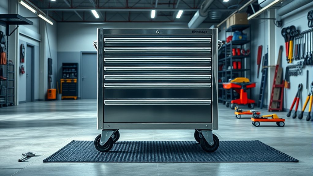 Mobility and ease of use are vital features that can make or break your experience with a rolling tool chest. Look for models with smooth-rolling wheels, preferably with locking mechanisms to keep the chest steady when needed. Ergonomic handles are essential, offering a comfortable grip and better control when moving the chest across different surfaces. Pay attention to the wheel’s weight capacity to support the entire load without damage or difficulty. Durable materials like rubber or polyurethane for the caster wheels ensure quiet operation and good traction on various floors. Finally, a balanced design with evenly distributed weight makes maneuvering effortless and reduces the risk of tipping. Prioritizing these features guarantees a tool chest that’s both functional and easy to handle.