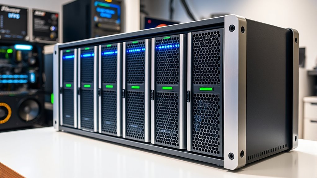Flexibility in storage options is essential for building a versatile home lab server. I look for servers that support multiple drives and various RAID configurations to guarantee data redundancy and ideal performance. Compatibility with different storage interfaces like SATA, SAS, or NVMe is critical, as it allows faster data transfer and room for future upgrades. I also check if the server makes expanding storage simple, whether through additional drive bays or modular solutions. Combining HDDs for capacity and SSDs for speed offers a tailored approach that meets diverse needs. Finally, reliable management tools are indispensable for monitoring storage health and performance over time, helping me maintain stability and prevent data loss. Prioritizing these factors ensures my home lab remains flexible, scalable, and efficient.