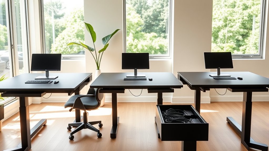 If you’re looking for the best sit-stand desks with cable management drawers in 2025, I’ve found five top options that offer adjustable heights, organized storage, and integrated cable solutions to keep your workspace clutter-free. These desks feature sturdy frames, smooth motors, and helpful accessories like drawers and hooks. Whether you prefer sleek modern styles or rustic finishes, these options deliver functionality and style. Stick around to discover which models suit your needs best.