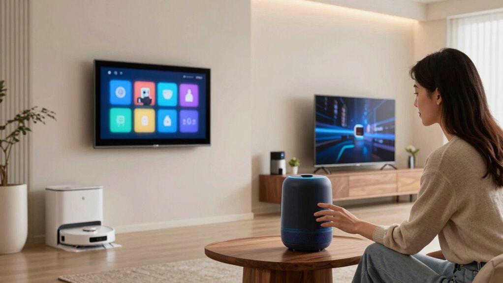 Have you considered how important voice control is in making your smart home truly hands-free and convenient? A system that supports multiple voice assistants like Alexa, Google Assistant, or Siri gives you flexible control options. Guarantee the system allows you to command individual devices, groups, or entire scenes for personalized automation. Pay attention to the accuracy and responsiveness of voice recognition—reliable commands are essential for smooth operation. Also, check if you need extra hardware, like smart speakers or hubs, for voice control to work properly. Some systems may require these additions, so understanding what’s needed upfront can save you time and frustration. Ultimately, choosing a system with seamless, multi-assistant compatibility makes managing your smart home effortless.