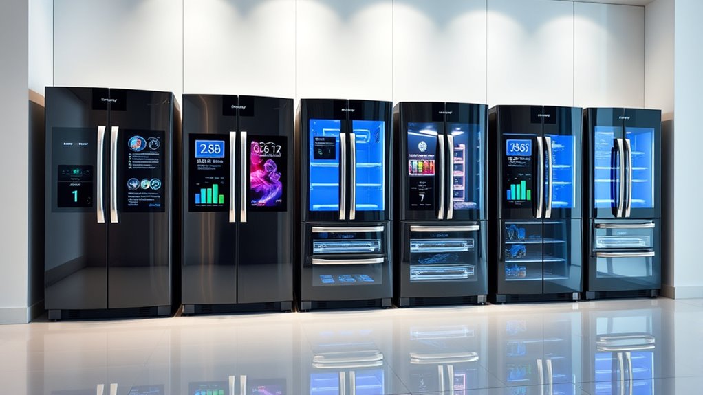When selecting a smart refrigerator, prioritizing energy efficiency can save you money and reduce your environmental impact. Look for ENERGY STAR certification to guarantee it meets high energy standards and consumes less electricity. Consider models with adjustable temperature zones and energy-saving modes, which help optimize power based on your usage patterns. Features like LED lighting and inverter compressors typically use less energy and operate more efficiently. Check the annual energy consumption in kWh/year to compare models effectively. Additionally, choose smart refrigerators with remote control and monitoring capabilities, so you can manage and adjust energy use proactively. These features help prevent unnecessary power consumption, ensuring your fridge is both eco-friendly and cost-effective over time.