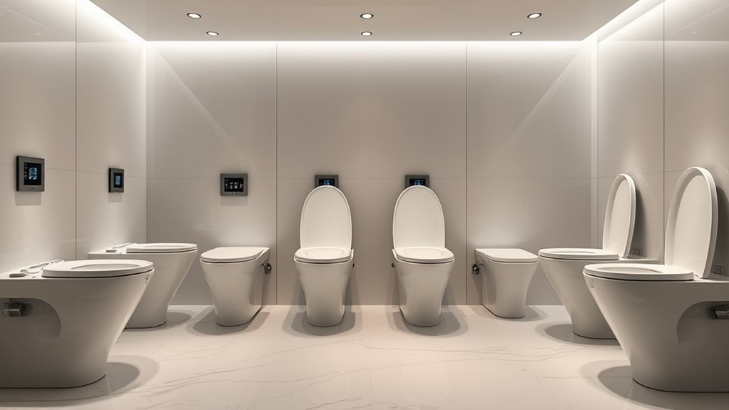 Automatic functions are a key feature to contemplate when choosing a smart toilet, as they considerably enhance hygiene and convenience. Sensors detect your presence to open and close the lid hands-free, reducing contact and promoting cleanliness. Many models automatically flush once you stand up, either through sensors or sit detection, minimizing manual effort. Built-in sensors can also manage bidet settings, adjusting water temperature, pressure, and spray position automatically or via remote control, ensuring a personalized experience. Auto-open and auto-close mechanisms help prevent cross-contamination by limiting surface contact. Sensor technology ensures reliable, consistent operation, often allowing customization of activation zones and timing. These features streamline daily routines, boost sanitation, and deliver a seamless, touchless experience that elevates comfort and hygiene standards.