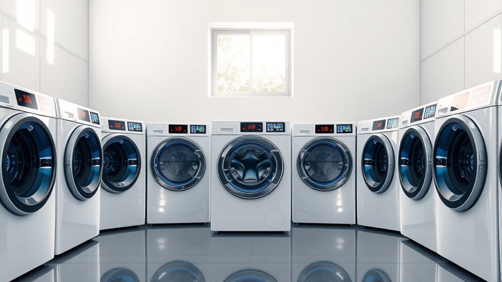 Ever wondered how smart features can make laundry more convenient and efficient? Many smart washing machines come with Wi-Fi connectivity, letting you control and monitor cycles remotely through mobile apps. They often have advanced sensors that automatically adjust settings based on load size and fabric type, delivering ideal cleaning without guesswork. Maintenance alerts are common, reminding you when to clean filters or run self-cleaning cycles, helping your machine last longer. Integration with home automation systems allows for voice commands and automated scheduling, streamlining your laundry routine. Plus, real-time notifications keep you updated on cycle completion or issues like leaks, enhancing convenience and safety. These smart features ensure your washing experience is smarter, safer, and more tailored to your needs.