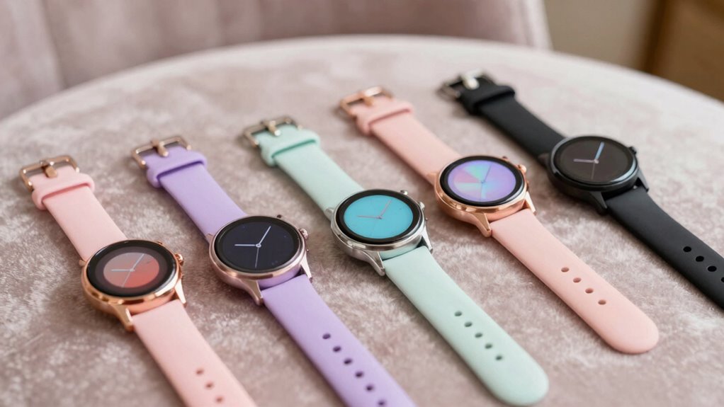 Selecting a stylish smartwatch for women with small wrists involves considering both design and customization options that reflect personal taste. Compact displays, typically between 1.1 and 1.85 inches, guarantee a comfortable fit without looking bulky. When it comes to style, options like elegant stainless steel, silicone, and leather straps come in various colors and textures, making it easy to match your wardrobe. Many watches offer customizable watch faces and the ability to upload personal photos, adding a unique touch. Embellishments such as diamonds, sleek metallic finishes, or minimalist designs can elevate the look for both casual and formal settings. Fashion-forward elements like Milanese bands or blush pink silicone straps cater specifically to women seeking versatility and elegance in their smartwatch.