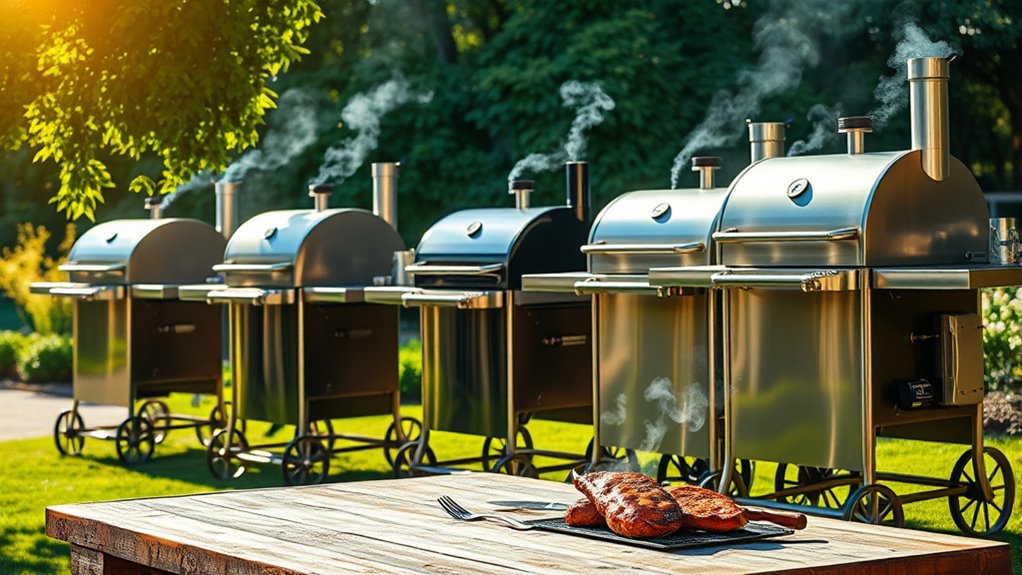 If you’re serious about elevating your barbecue game in 2025, I recommend exploring some of the best smoker grills out there. From versatile digital pellet smokers like the Traeger Pro 22 and Z GRILLS ZPG-450A to large-capacity models such as the Masterbuilt Electric Vertical and East Oak 30”, there’s something for every style and need. These options combine precise temperature control, authentic woodfire flavor, and durability. Keep going to discover the top picks and what makes each one special.
