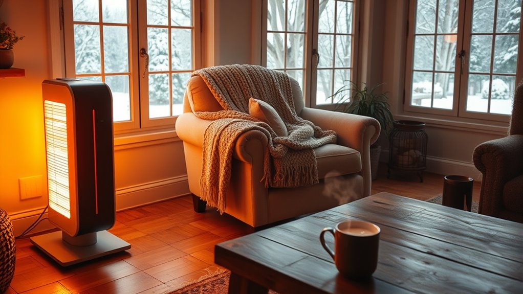 Choosing a space heater for a large room involves more than just looking at heating capacity; I find that portability and design play essential roles too. A lightweight and compact heater with built-in handles or wheels makes it easy to move between rooms, which is a huge plus. I prefer tall, narrow tower designs as they allow for better airflow and fit easily into tight spaces. Heaters with at least 6-foot cords offer flexible positioning without needing extension cords. Easy-to-use controls, like remote controls or touchscreens, add convenience when I want to adjust settings from afar. Ultimately, I always check for safety features like tip-over protection and cool-touch exteriors, ensuring safe use while I’m on the move.