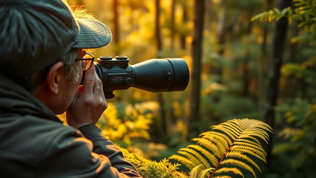 Choosing a spotting scope that’s easy to use can make a significant difference during your birding excursions. Look for models with intuitive focusing mechanisms, like dual or smooth focus wheels, which let you quickly lock onto targets and fine-tune your view. Angled eyepieces can boost comfort, especially during long sessions, reducing neck strain. Lightweight and portable designs with simple setup processes help you deploy your scope swiftly in the field. Clear, user-friendly eyepiece adjustments, such as twist-up or rubber eyecups, improve viewing comfort whether you wear glasses or not. Features like integrated sunshades and straightforward tripod mounting also enhance ease of handling in different lighting conditions. Overall, ease of use is vital for a smooth, enjoyable birding experience.