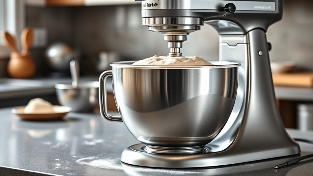 Choosing a durable stand mixer means prioritizing high-quality materials that can withstand frequent and intensive bread-making sessions. I look for models built with sturdy metal components like stainless steel or die-cast aluminum, which resist corrosion and last longer. The motor housing and internal gears should be made from reinforced materials to handle heavy dough loads without wearing out. Securely mounted bowls and attachment hubs with strong locking mechanisms prevent wobbling or detachment during vigorous kneading. The overall frame should feature strengthened joints and thick panels to endure the stresses of bread dough. Additionally, exterior materials should be easy to clean and stain-resistant, keeping the mixer looking new over time. These build qualities ensure my mixer remains reliable and efficient through countless baking sessions.