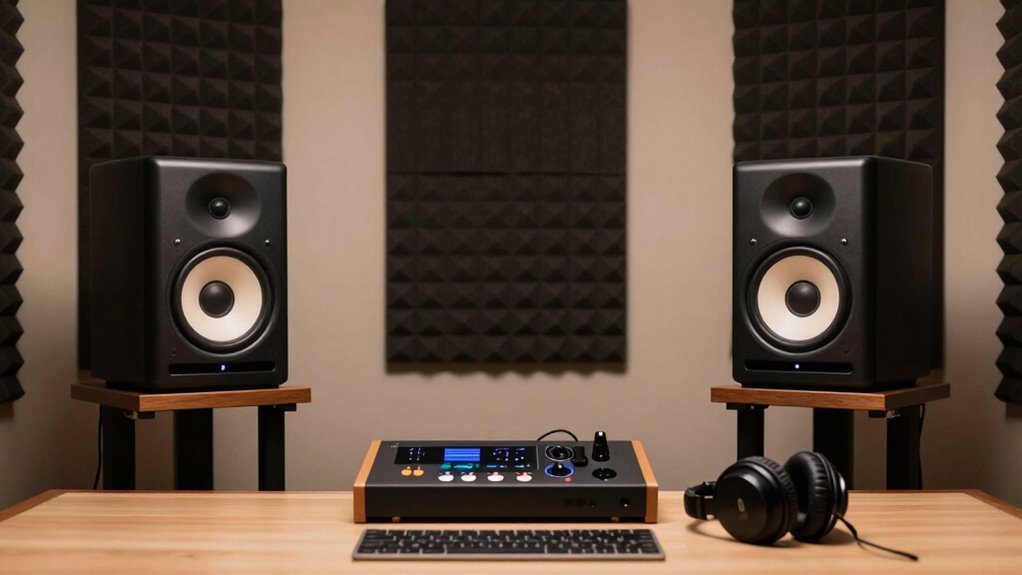 Achieving excellent sound quality clarity in your home studio depends heavily on selecting monitors with a flat frequency response, which guarantees the audio remains precise and free from coloration. Clear sound involves well-defined highs, mids, and lows, enabling accurate mixing and mastering. Monitors with silk dome tweeters and well-damped woofers enhance transient response, resulting in crisp, detailed audio. Low total harmonic distortion (THD) is essential to maintain clarity and prevent muddiness. Additionally, accurate stereo imaging and a broad sweet spot ensure sound remains clear across different listening angles. These factors combined help you hear every detail accurately, making it easier to make informed mixing decisions and produce professional-quality recordings right from your home studio.