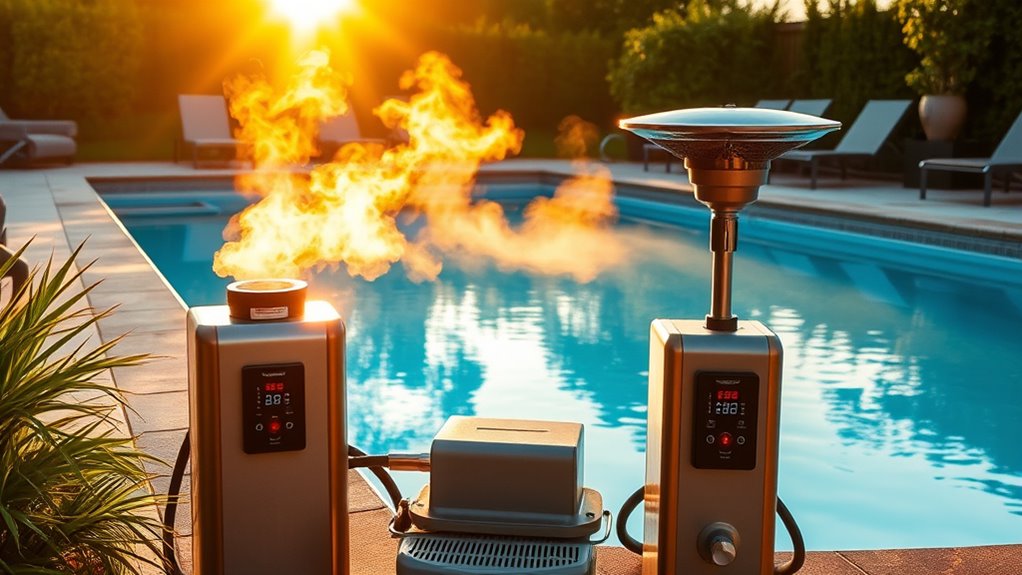 Think of a pool heater as a trusted guardian; you want safety features like automatic shut-off if temperatures get too high, a high-limit switch to prevent overheating, and corrosion-resistant elements for longevity. I look for clear, easy-to-understand controls and reliable safety certifications. These features guarantee peace of mind, letting me relax and enjoy my swim without worrying about potential hazards.