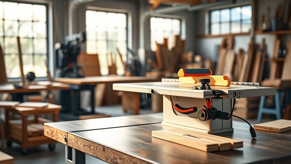 Portability is a crucial factor to contemplate when selecting a table saw, especially if you need to move it between job sites or store it in a limited space. Look for lightweight designs or foldable stands that make transportation and storage easier. Models with built-in handles, wheels, or carry cases substantially enhance mobility, allowing for quick and effortless movement. Check if the saw’s dimensions are compact enough to fit comfortably in your workspace or vehicle, saving you space and hassle. Additionally, consider how easy it is to set up and break down the saw—quick-release fences and adjustable stands are great features that streamline this process. Prioritizing these portability features ensures you can work efficiently, no matter where your projects take you.
