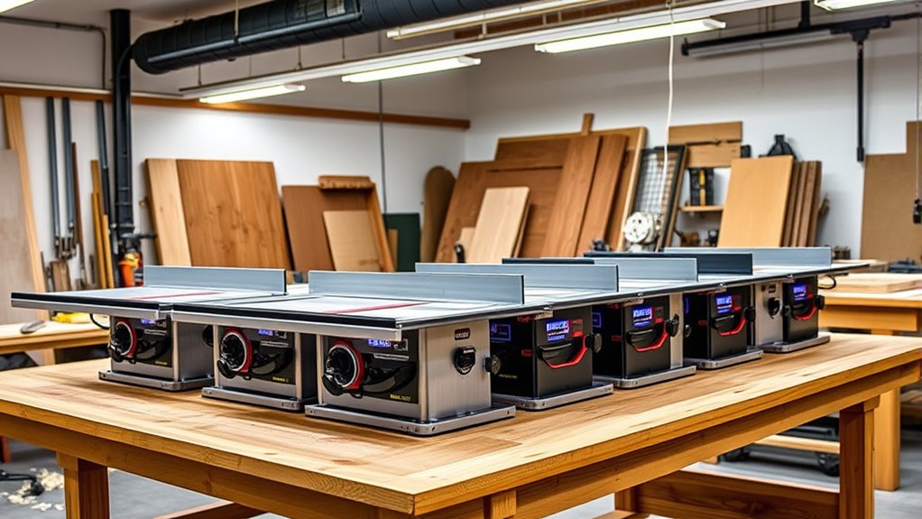 When evaluating a table saw, I pay close attention to its adjustability and precision because these features directly influence the quality of my cuts. Precise adjustments for blade height and bevel angle ensure I get accurate cuts and better control over my material. Micro-adjustment features allow me to fine-tune the fence and blade alignment, maintaining consistency across multiple cuts. Dual rack and pinion systems make it easy to adjust the rip fence and miter gauge smoothly and quickly, saving time and effort. Locking mechanisms for fences and angles prevent shifts during operation, boosting accuracy. Clear measurement markings and scalable guides help me set and verify cut parameters precisely, reducing errors. Overall, these features ensure my work is accurate, consistent, and efficient.