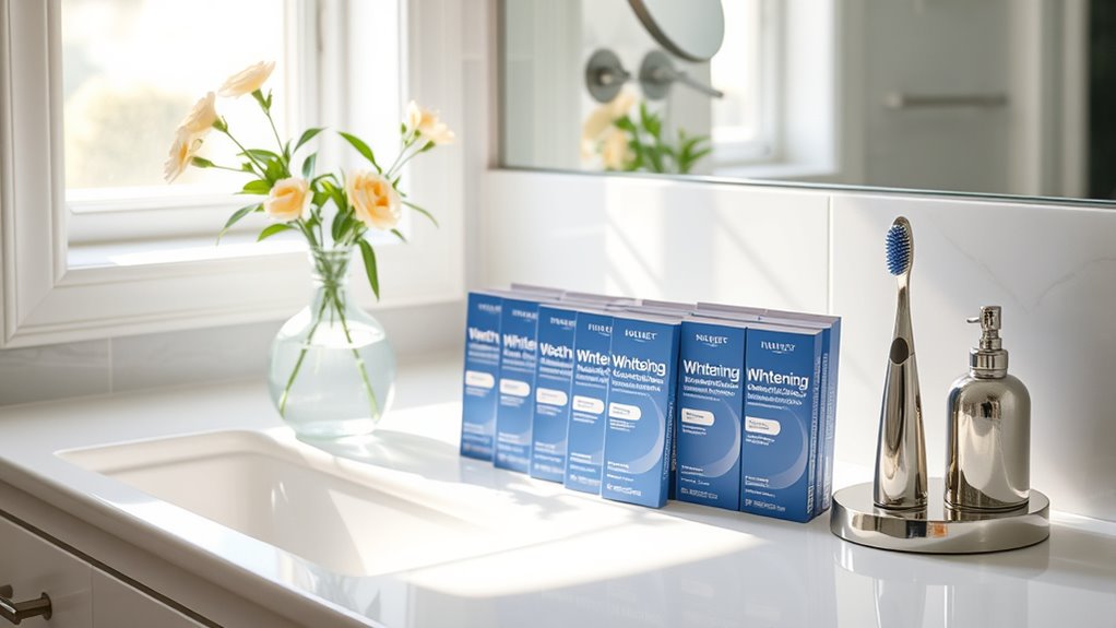 As I explore teeth whitening strips for sensitive teeth, I quickly realize that packaging and quantity options play a vital role in my selection process. I find small boxes with 14 strips perfect for trial or occasional use, while bulk packs with 42 or more strips suit my longer-term whitening goals. I appreciate that some packages come with bonus strips for touch-ups, giving me flexibility. Whether I choose a 7-day, 14-day, or 21-day treatment plan, it’s important to consider how many strips I need for daily use. This way, I can find the right balance between effectiveness and my commitment level, ensuring I achieve the bright smile I’m aiming for without overwhelming my sensitive teeth.