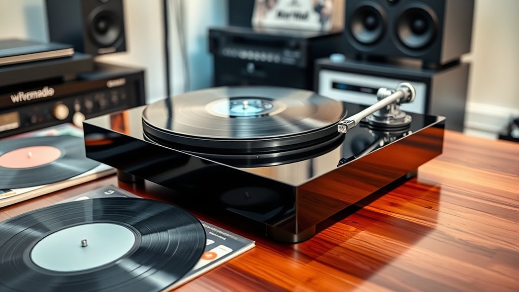 The sound quality of a turntable with USB output largely depends on the stylus and cartridge it uses. A high-quality stylus, like a diamond-tipped or moving magnetic cartridge, guarantees precise groove tracking, delivering clear, detailed sound. The stylus’s material and design directly influence fidelity and warmth, with better materials reducing distortion. Proper alignment and tracking force are essential to avoid record damage and maintain peak audio quality. The type of cartridge, whether moving magnet or moving coil, also affects the overall sound—clarity, richness, and frequency response. Additionally, a turntable with vibration damping features enhances stylus performance, resulting in less skipping and more consistent sound. Prioritizing these aspects helps assure your vinyl playback sounds its best, both analog and digitized.