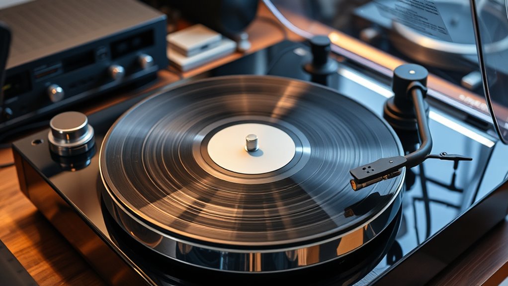 Turntables substantially impact overall audio quality beyond speakers because they convert vinyl grooves into sound with precise clarity and warmth. I find that a high-quality turntable minimizes vibrations and reduces noise, ensuring cleaner playback. The tonearm, cartridge, and platter all influence sound accuracy. When I choose a good turntable, I notice richer bass, clearer mids, and more detailed highs, elevating my entire listening experience beyond just the speakers.