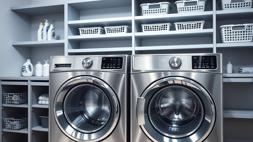 Energy efficiency should be a top priority when selecting washer and dryer sets, as it directly impacts your utility bills and environmental footprint. Look for models with ENERGY STAR certification, which guarantees they meet strict efficiency standards set by the EPA and DOE. Check the annual energy consumption ratings, such as kWh for dryers and water usage per cycle for washers, to compare effectiveness levels. Consider appliances with advanced sensors that automatically adjust cycle times and water levels, ensuring ideal use of resources. Many energy-efficient models also feature eco-friendly modes designed to cut electricity and water use without sacrificing cleaning performance. Review the product specs for low standby power and high cycle efficiency to maximize savings and minimize your environmental impact.
