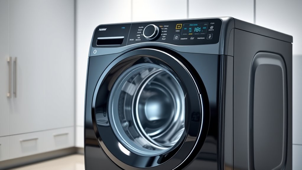 Energy efficiency is a crucial factor to take into account because it directly impacts your utility bills and environmental footprint. When choosing a washing machine with a steam function, look for ENERGY STAR certification. This label guarantees reduced energy and water consumption, helping you save money and protect the environment. Higher efficiency ratings often mean the appliance uses advanced technology, like inverter motors and optimized wash cycles, which conserve power during operation. Machines with superior ratings typically offer multiple temperature settings and steam cycles that improve cleaning while minimizing energy use. ENERGY STAR certified steam washers can use up to 90% less energy compared to non-certified models, resulting in significant utility savings over time. Reviewing these ratings ensures you select an eco-friendly, cost-effective machine that meets your cleaning needs.