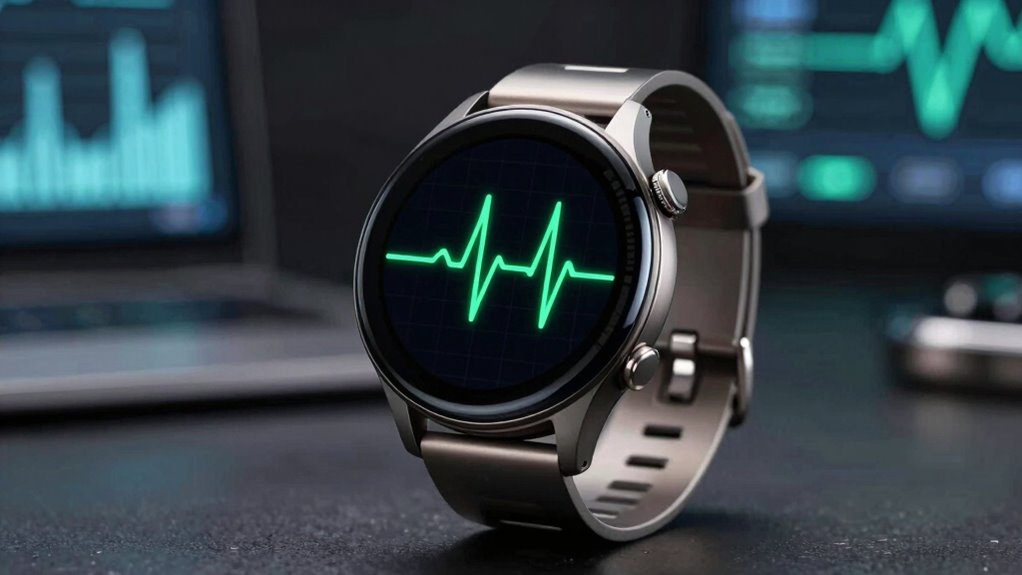 Choosing a smartwatch with ECG capabilities becomes even more valuable when it offers additional health features that give a fuller picture of your well-being. Features like blood oxygen monitoring, skin temperature sensors, and sleep tracking help you understand your overall health better. ECG-enabled watches often include irregular heart rhythm alerts and atrial fibrillation assessments, catching potential issues early. Blood pressure monitoring and stress detection complement ECG data, providing insights into cardiovascular health and daily stress levels. Some watches feature health metrics dashboards that combine ECG, SpO2, and sleep data for easy interpretation. Safety features like fall detection and emergency alerts add extra security, ensuring help is available when needed. These extras make smartwatches more extensive tools for maintaining your heart health and overall wellness.