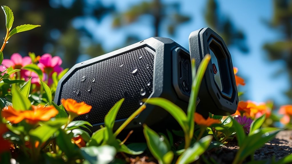 Choosing the right materials is vital for guaranteeing your waterproof outdoor speaker can withstand harsh environmental conditions. I look for speakers made from durable materials like polypropylene, aluminum, or ABS plastic, which resist corrosion and impact. Rubber or silicone seals are indispensable—they keep water out at joints, ports, and openings. Marine-grade materials are a plus, as they handle saltwater, UV rays, and temperature changes without breaking down. I also pay attention to the enclosure’s coating—waterproof paint or special finishes add extra protection against moisture and weather. Rugged, shock-resistant materials are important too, helping the speaker endure bumps, vibrations, and accidental drops. Overall, high-quality durability materials ensure your speaker lasts through outdoor adventures, rain, and sun without losing performance.