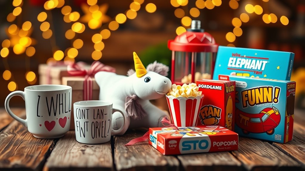 Selecting a humorous gift can truly transform your White Elephant exchange. I’ve found that gifts that evoke laughter create a lively atmosphere, making the event unforgettable. When you incorporate witty or playful elements, you not only entertain but also spark conversation among guests. Gag gifts that surprise or amuse often steal the show, outshining traditional presents. The best funny gifts under $50 strike a balance between humor and usability, ensuring the recipient appreciates both the joke and the item. Choosing humor-filled gifts encourages lighthearted interactions, helping everyone break the ice and enjoy the festivities. Trust me, a well-chosen funny gift can lift the holiday spirit and leave everyone smiling long after the party ends.