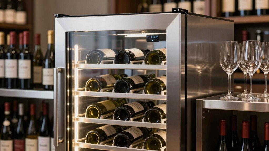 Choosing the right temperature zones in a wine cooler is essential because it directly impacts how well your wines are preserved and enjoyed. Dual-zone coolers offer the flexibility to set different temperatures for red and white wines, typically with an upper zone from 40°F to 55°F for whites and sparklers, and a lower zone from 55°F to 65°F for reds. This allows you to serve wines at their ideal temperatures while storing them properly. Single-zone coolers maintain one consistent temperature, which suits collectors with a uniform collection. Adjustable zones provide even more customization, letting you fine-tune conditions based on specific wines or preferences. Selecting the right zone setup guarantees maximum preservation and enhances your wine experience.